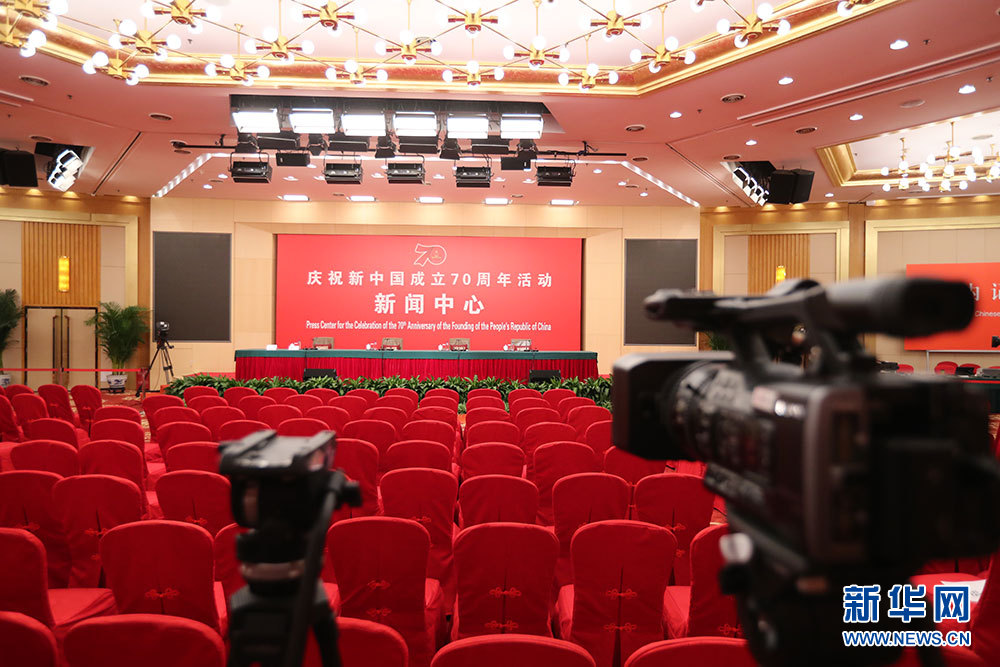 9月24日,慶祝中華人民共和國成立70周年活動(dòng)新聞中心在北京梅地亞中心二層新聞發(fā)布廳舉辦第一場新聞發(fā)布會(huì)。圖為新聞中心的發(fā)布會(huì)現(xiàn)場。新華網(wǎng) 雷東瑞 攝