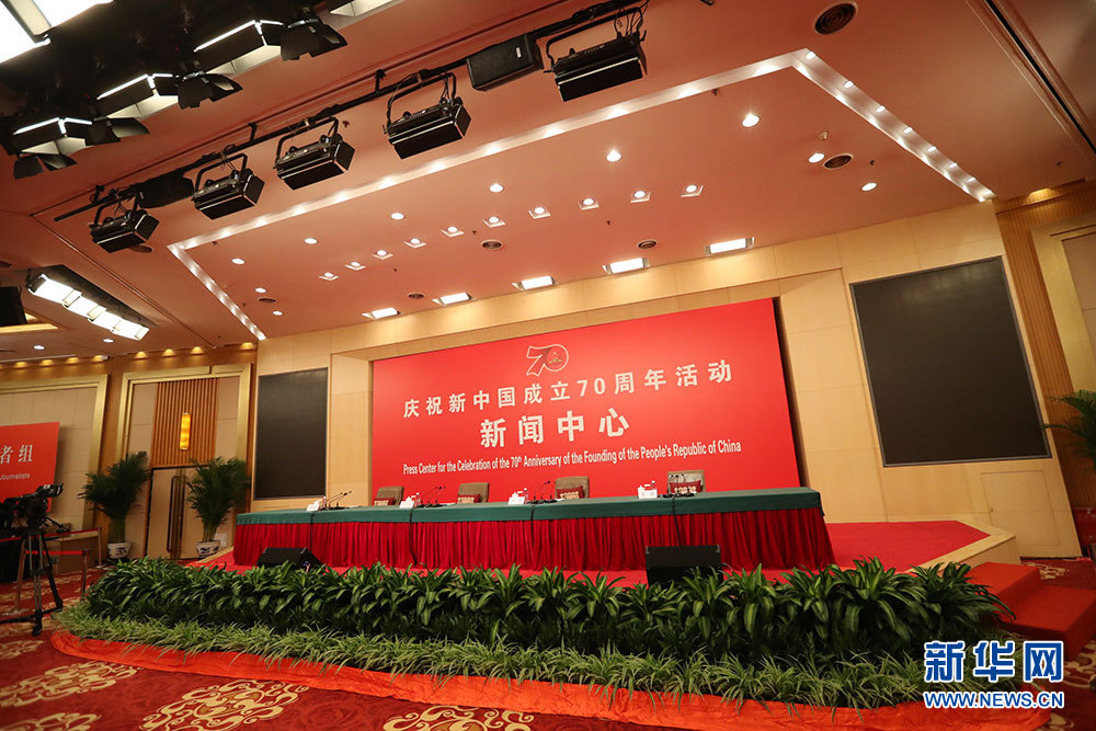 9月24日,慶祝中華人民共和國(guó)成立70周年活動(dòng)新聞中心在北京梅地亞中心二層新聞發(fā)布廳舉辦第一場(chǎng)新聞發(fā)布會(huì)。圖為新聞發(fā)布會(huì)開(kāi)始前的現(xiàn)場(chǎng) 。新華網(wǎng)記者 陳競(jìng)超 攝?