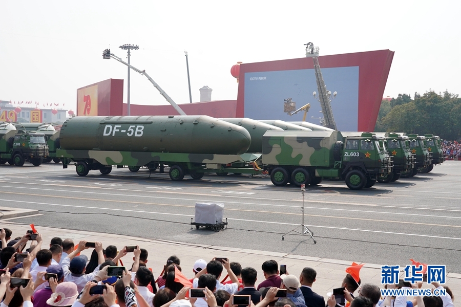 10月1日上午,慶祝中華人民共和國成立70周年大會(huì)在北京天安門廣場(chǎng)隆重舉行。這是東風(fēng)-5B核導(dǎo)彈方隊(duì)。 新華社記者 楊世堯 攝