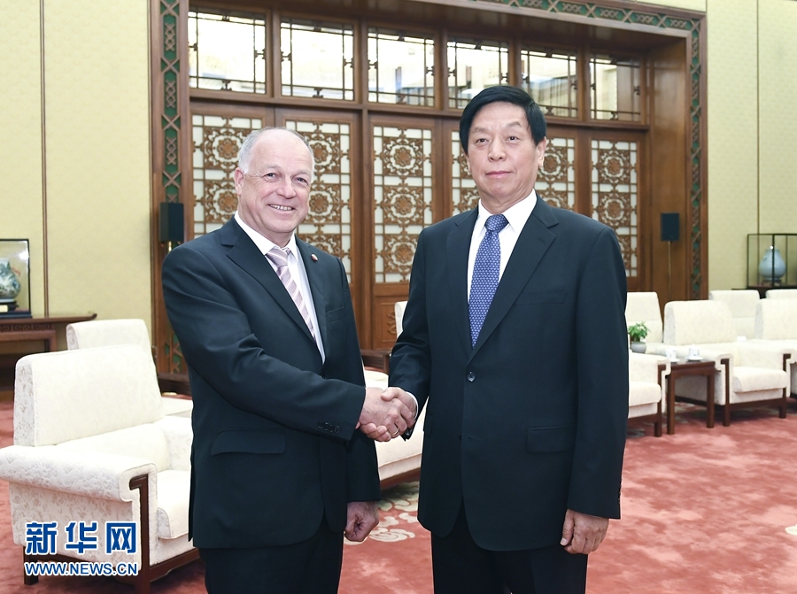6月10日,全國(guó)人大常委會(huì)委員長(zhǎng)栗戰(zhàn)書(shū)在北京會(huì)見(jiàn)以?shī)W地利聯(lián)邦議會(huì)議長(zhǎng)英戈·阿佩為團(tuán)長(zhǎng)的奧中友協(xié)高級(jí)代表團(tuán)。 新華社記者 燕雁 攝