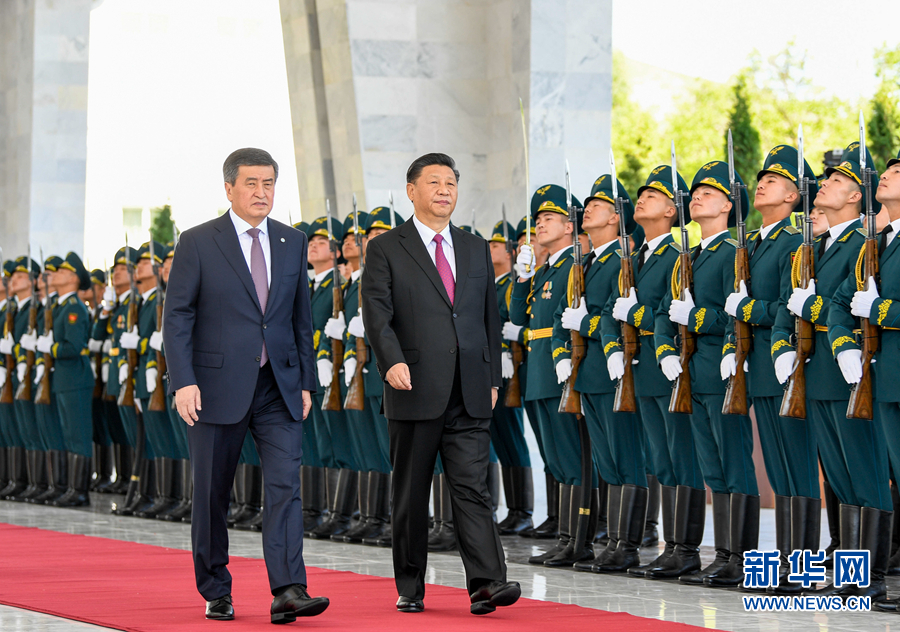6月13日,國家主席習近平在比什凱克同吉爾吉斯斯坦總統(tǒng)熱恩別科夫會談。會談前,熱恩別科夫在阿拉爾恰國賓館會議中心前廣場為習近平舉行隆重歡迎儀式。這是兩國元首檢閱儀仗隊。 新華社記者 高潔 攝
