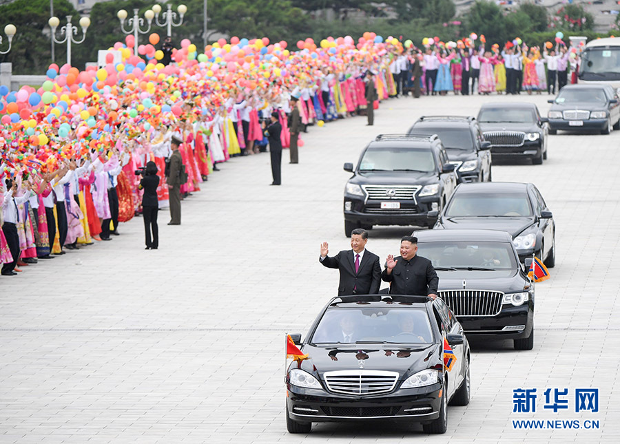 歡迎儀式結(jié)束后,在21輛禮賓摩托車的護(hù)衛(wèi)下,習(xí)近平乘車前往錦繡山迎賓館。沿途數(shù)十萬(wàn)群眾揮舞中朝兩國(guó)國(guó)旗和五彩繽紛的鮮花,熱情洋溢地高呼中朝友誼萬(wàn)歲等口號(hào),夾道歡迎。