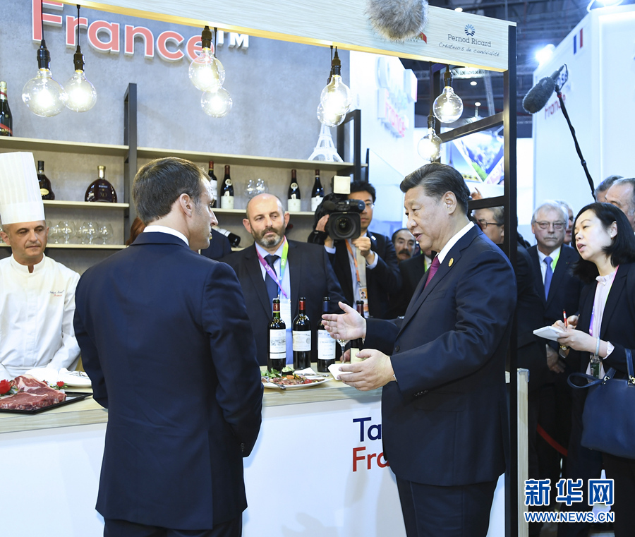 習(xí)近平在法國總統(tǒng)馬克龍陪同下首先來到法國館。馬克龍熱情邀請習(xí)近平品嘗法國紅酒和牛肉食品。在場法國企業(yè)家爭先恐后向習(xí)近平表示,法國企業(yè)看好中國市場,希望進一步擴大對華出口。習(xí)近平指出,中國消費市場很大,可以滿足不同層次的多樣化需求,希望法國企業(yè)家展現(xiàn)長遠(yuǎn)眼光,同中國加強互利合作。