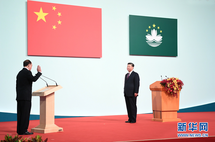 12月20日,慶祝澳門回歸祖國20周年大會暨澳門特別行政區(qū)第五屆政府就職典禮在澳門東亞運動會體育館隆重舉行。中共中央總書記、國家主席、中央軍委主席習近平出席并發(fā)表重要講話。這是習近平監(jiān)誓,澳門特別行政區(qū)第五任行政長官賀一誠宣誓就職。 新華社記者 謝環(huán)馳 攝