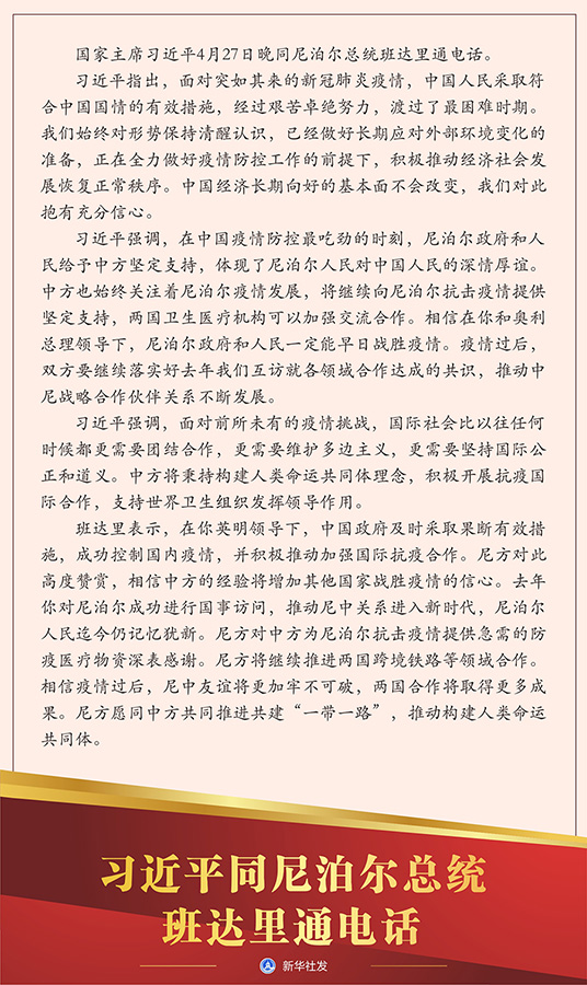新華社北京4月27日電 國家主席習(xí)近平27日晚同尼泊爾總統(tǒng)班達(dá)里通電話。