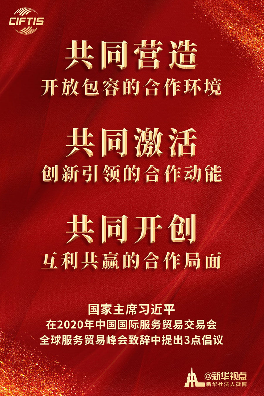 “希望以此為契機(jī),搭建起平臺和橋梁,讓各國人民充分展示服務(wù)貿(mào)易領(lǐng)域新發(fā)展新突破,共同享受人類社會發(fā)展進(jìn)步新技術(shù)新成果?!绷?xí)近平主席在致辭中說。