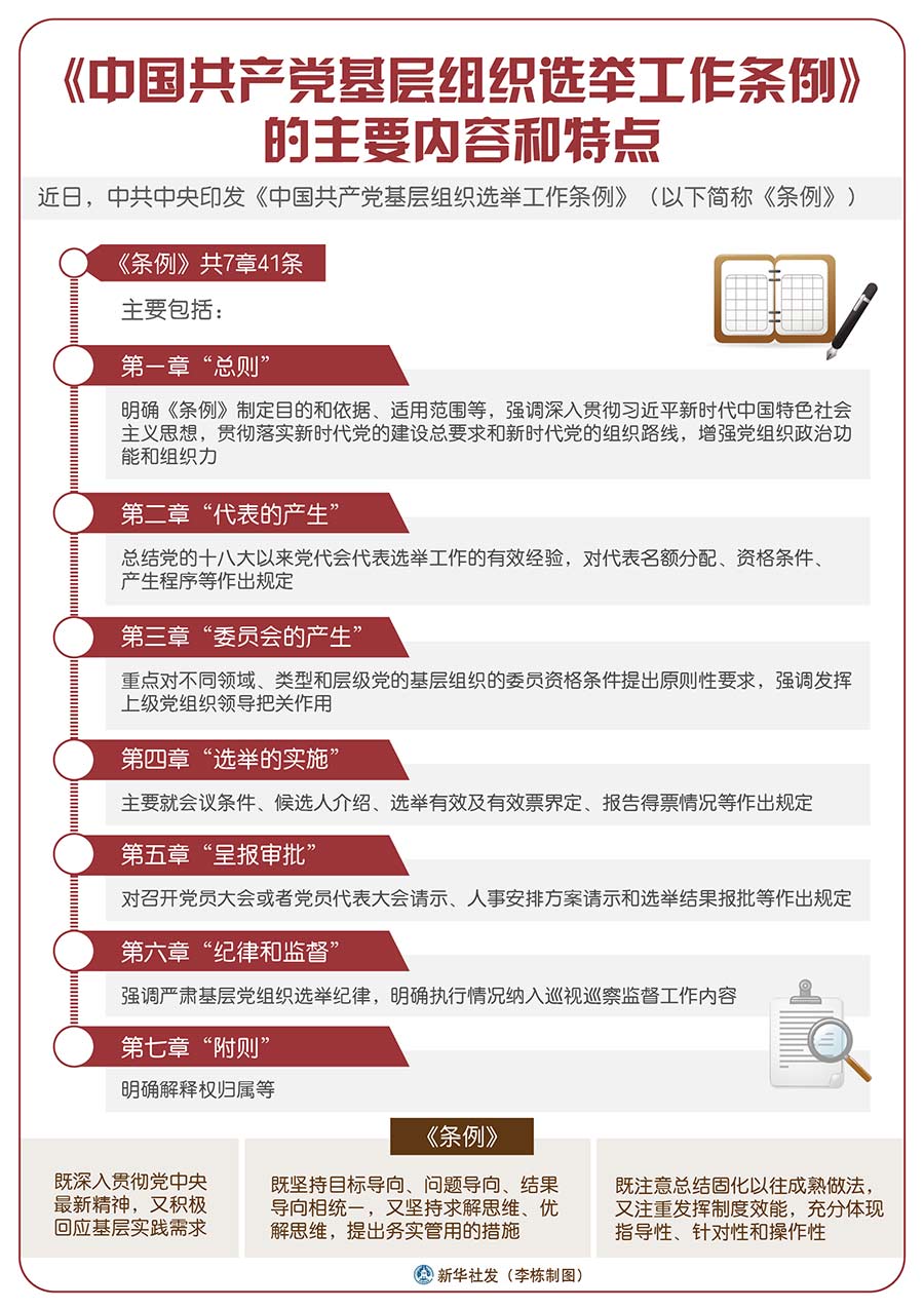 《條例》堅持以習近平新時代中國特色社會主義思想為指導,以黨章為根本遵循,深入貫徹黨的十九大和十九屆二中、三中、四中全會精神,貫徹落實新時代黨的建設(shè)總要求和新時代黨的組織路線,是新時代基層黨組織選舉工作的基本遵循。《條例》的制定和實施,對于發(fā)揚黨內(nèi)民主、尊重和保障黨員民主權(quán)利、規(guī)范基層黨組織選舉,增強基層黨組織政治功能和組織力,把基層黨組織建設(shè)成為宣傳黨的主張、貫徹黨的決定、領(lǐng)導基層治理、團結(jié)動員群眾、推動改革發(fā)展的堅強戰(zhàn)斗堡壘,鞏固黨長期執(zhí)政的組織基礎(chǔ),具有重要意義。