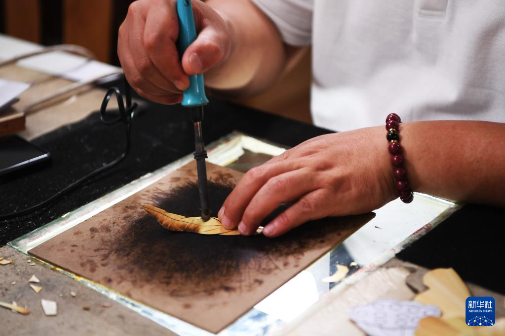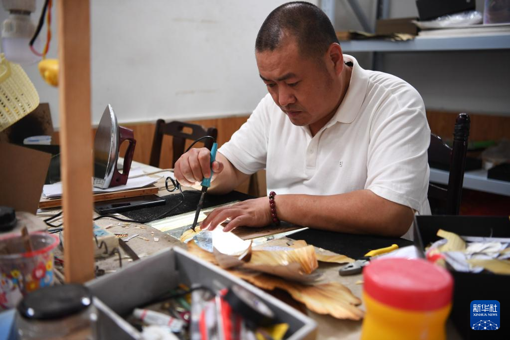 5月16日,葛磊在非遗传习基地制作芦苇画时进行烙烫。