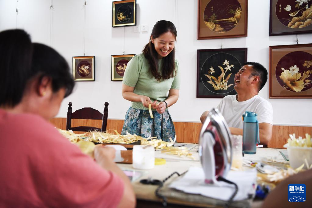 5月17日,张富扬(左)在非遗传习基地制作芦苇画。
