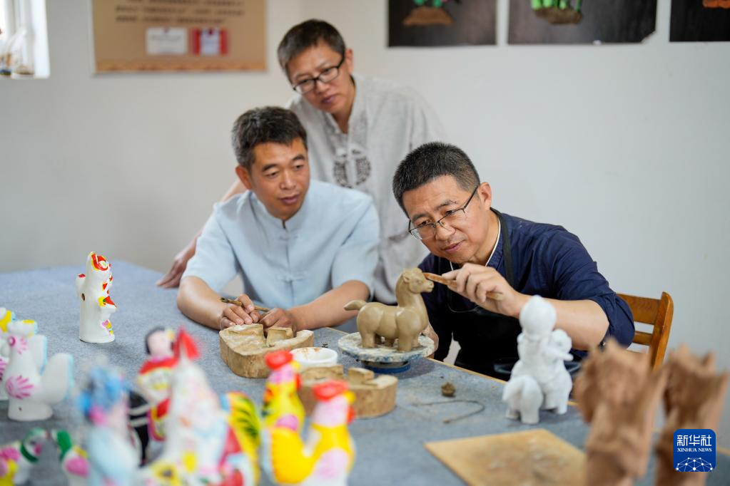6月1日,泥塑艺人在河北省玉田县亮甲店镇的一家泥塑工作室内探讨泥塑创作技巧。