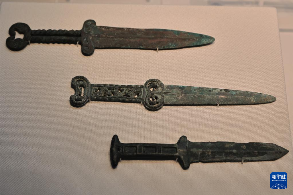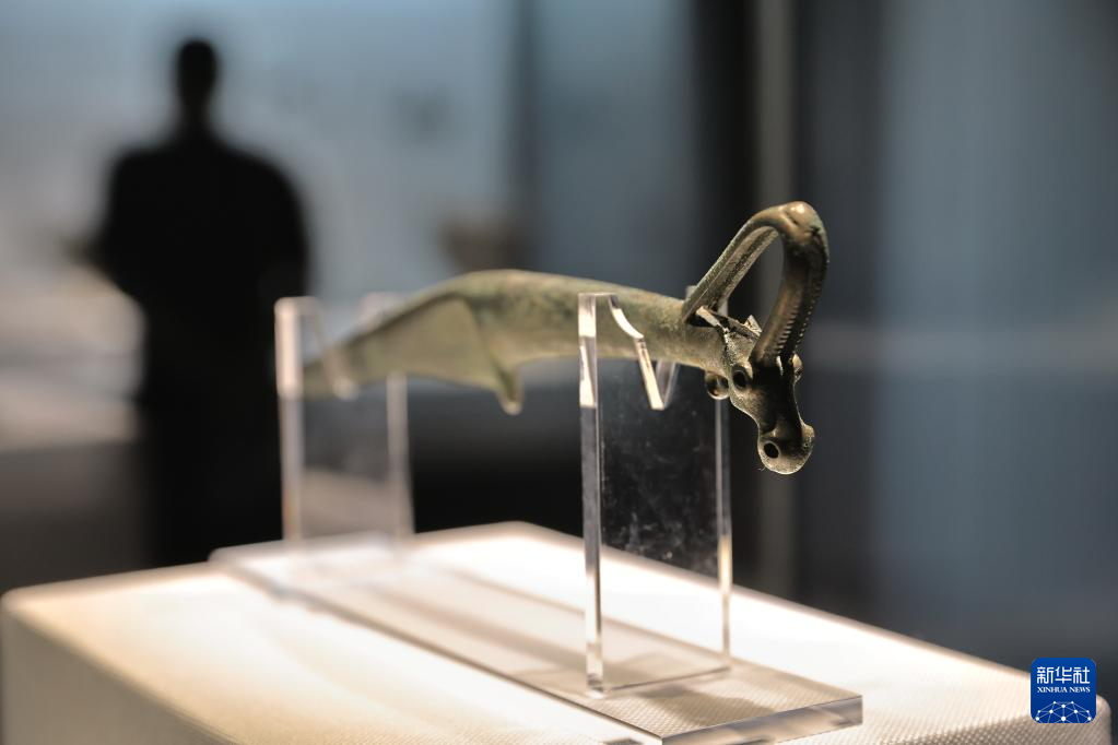 6月9日在“鄂尔多斯青铜器文物精品展”拍摄的青铜短剑。