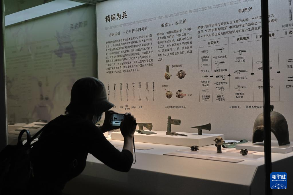 6月9日,参观者在“鄂尔多斯青铜器文物精品展”拍摄青铜兵器。