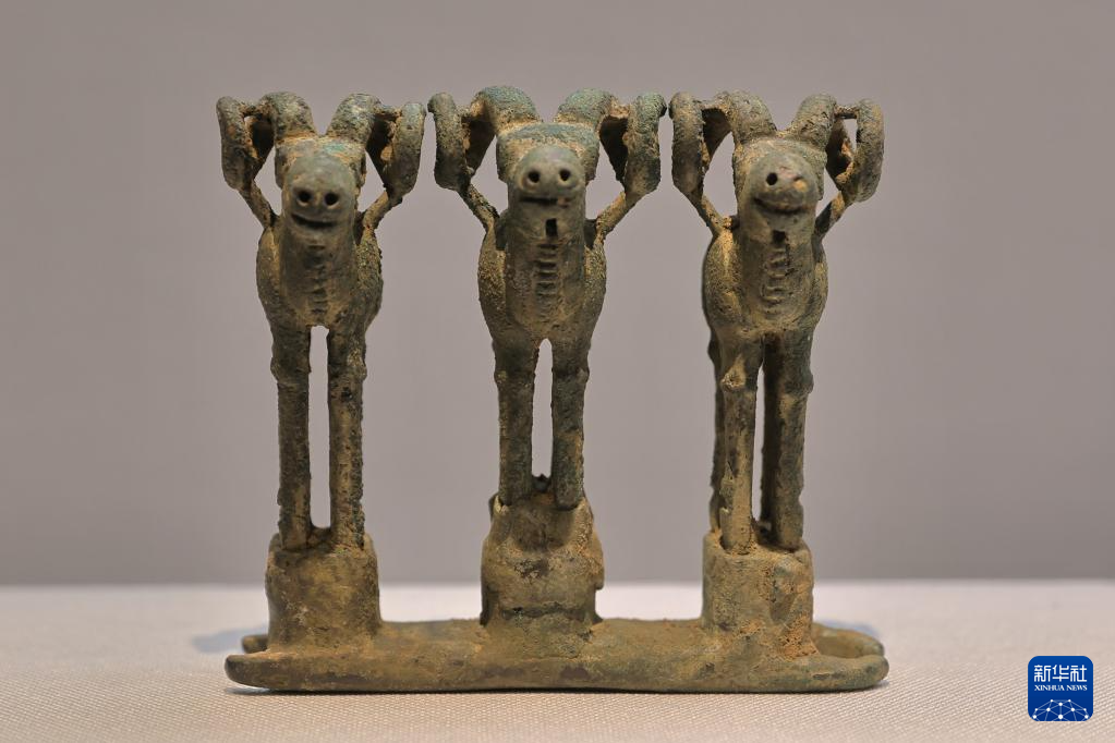 6月9日在“鄂尔多斯青铜器文物精品展”拍摄的展品“三羊形青铜车饰”。