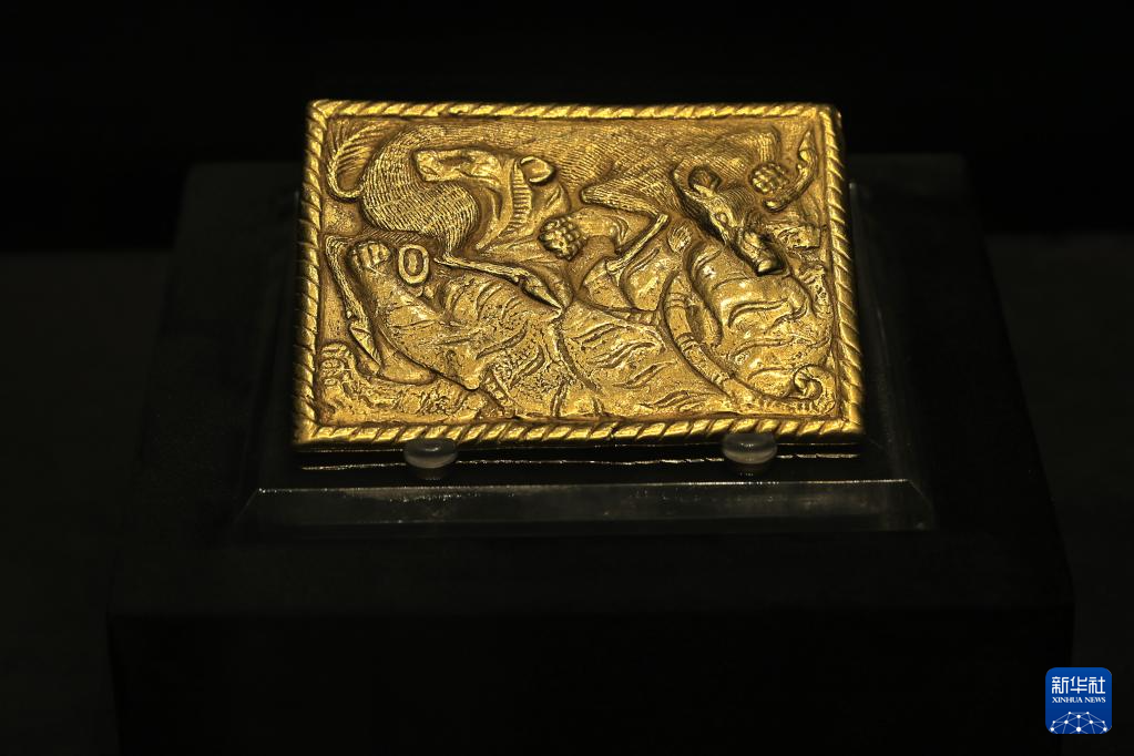 6月9日在“鄂尔多斯青铜器文物精品展”拍摄的展品“虎豕咬斗纹金饰牌”。