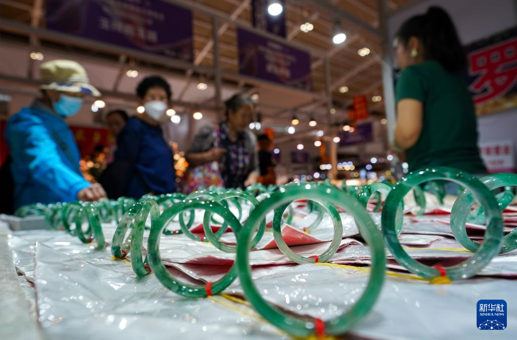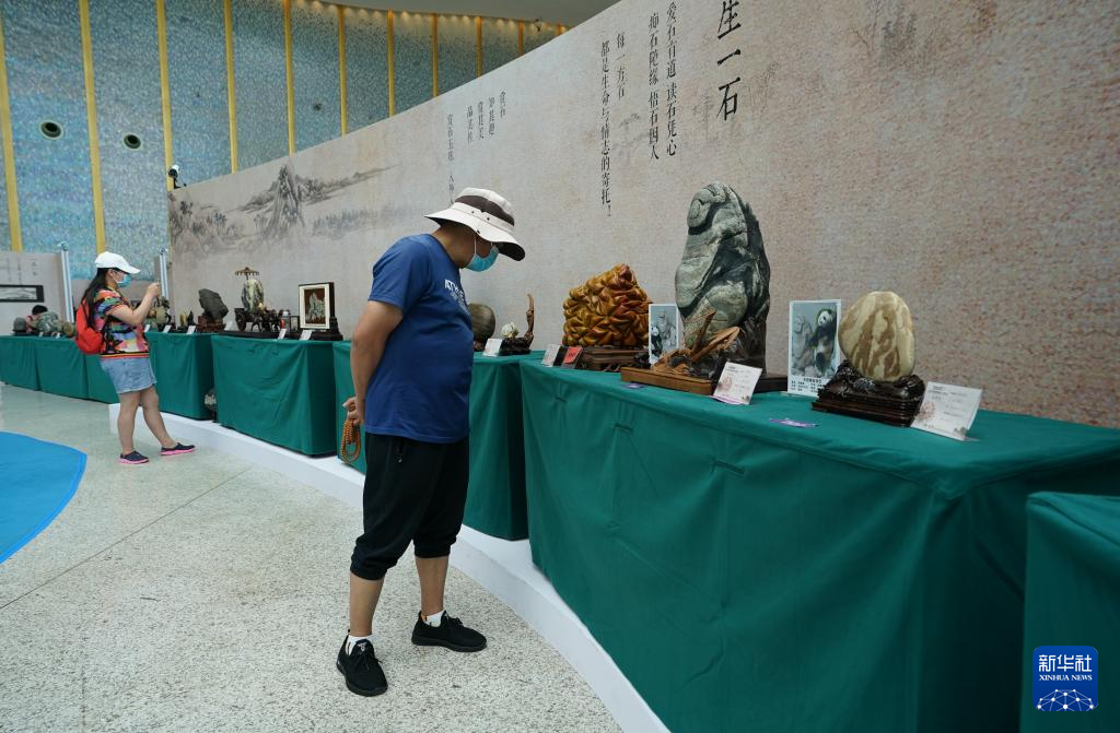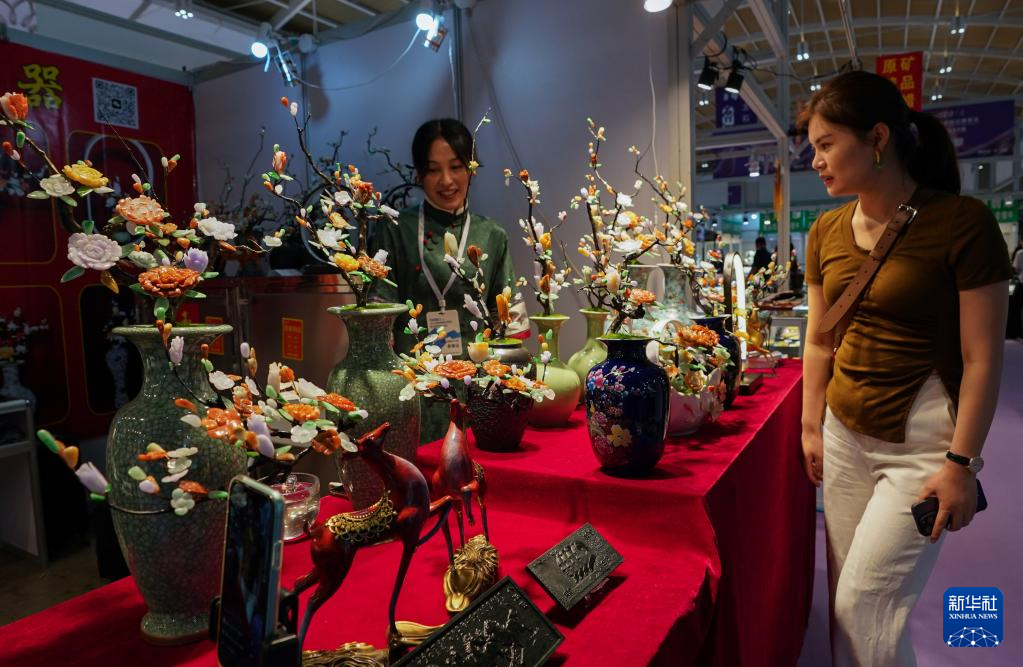 7月6日,一名参观者(右)在石博会上观看由玉石制作的插花。
