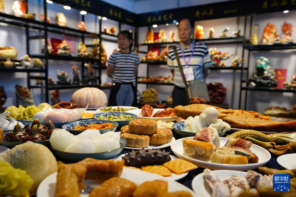 这是7月6日在石博会上拍摄的各类菜肴石雕。
