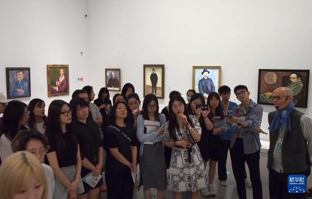 7月20日,蓬皮杜中心策展人弗雷德里克·保罗(右一)在上海西岸美术馆为媒体记者导览。