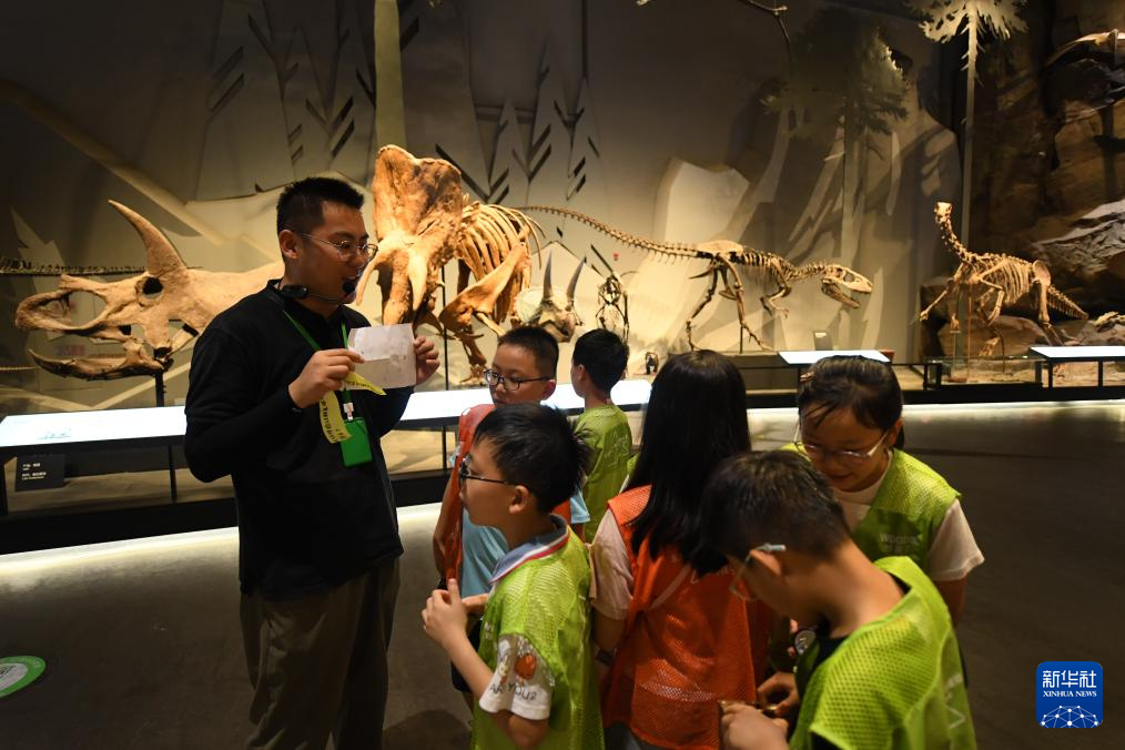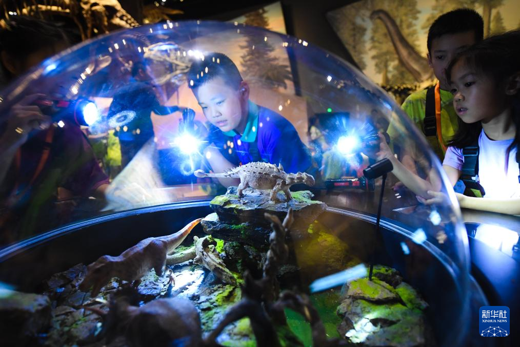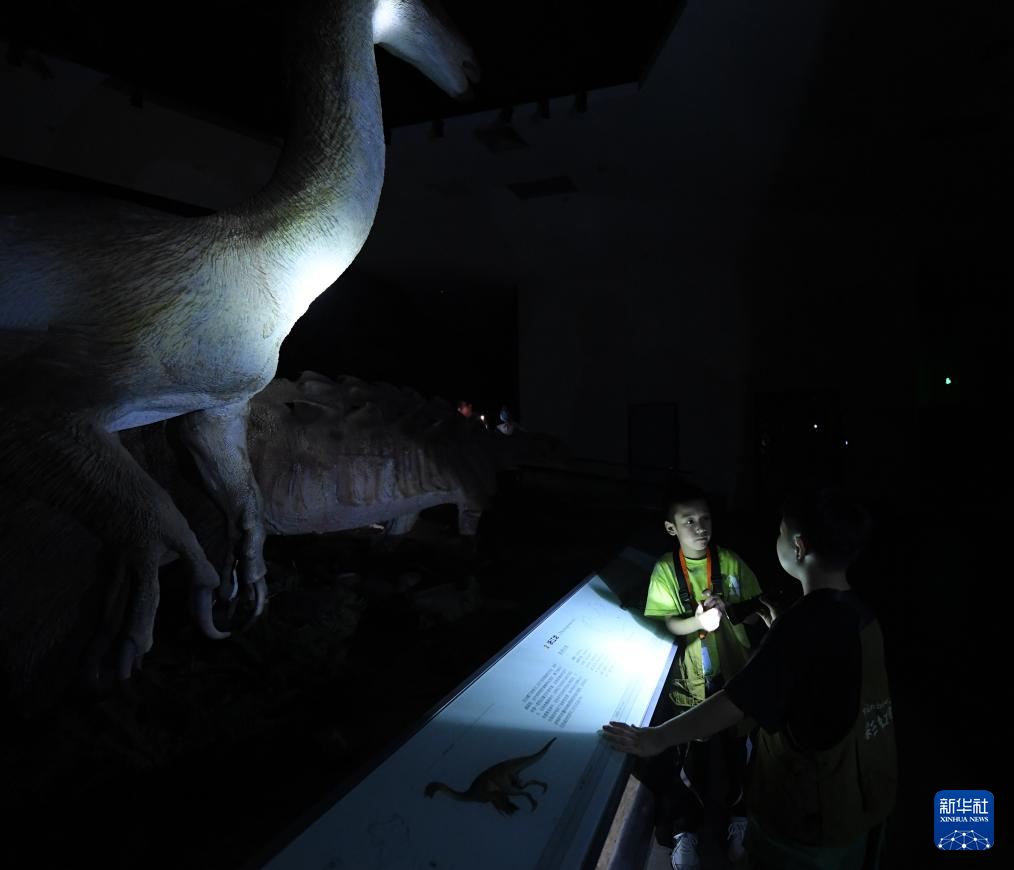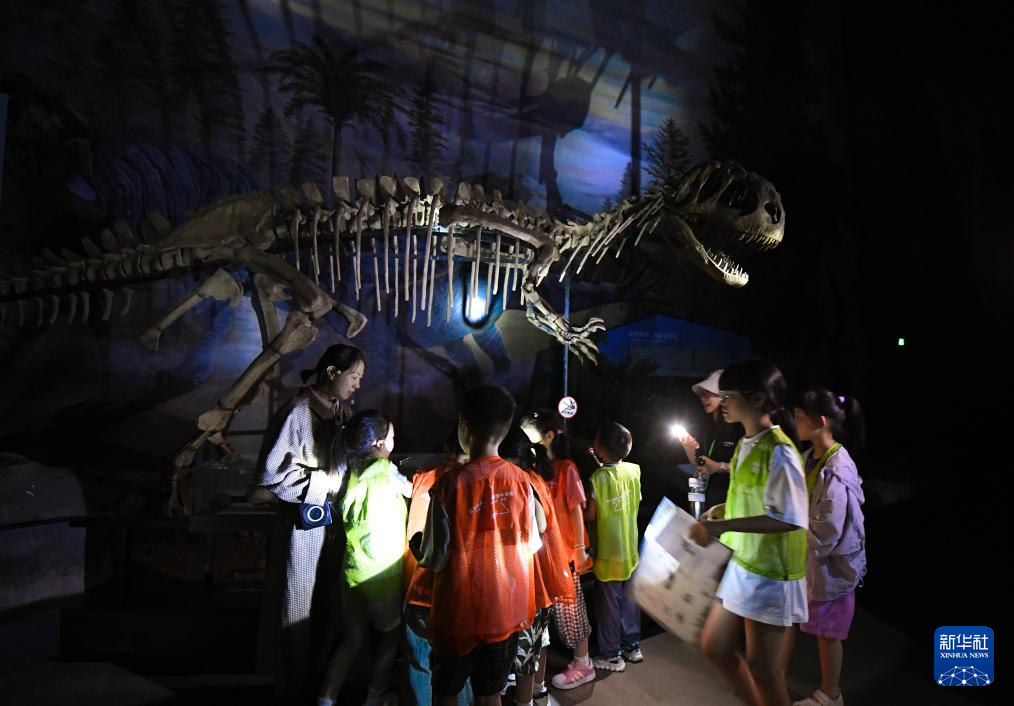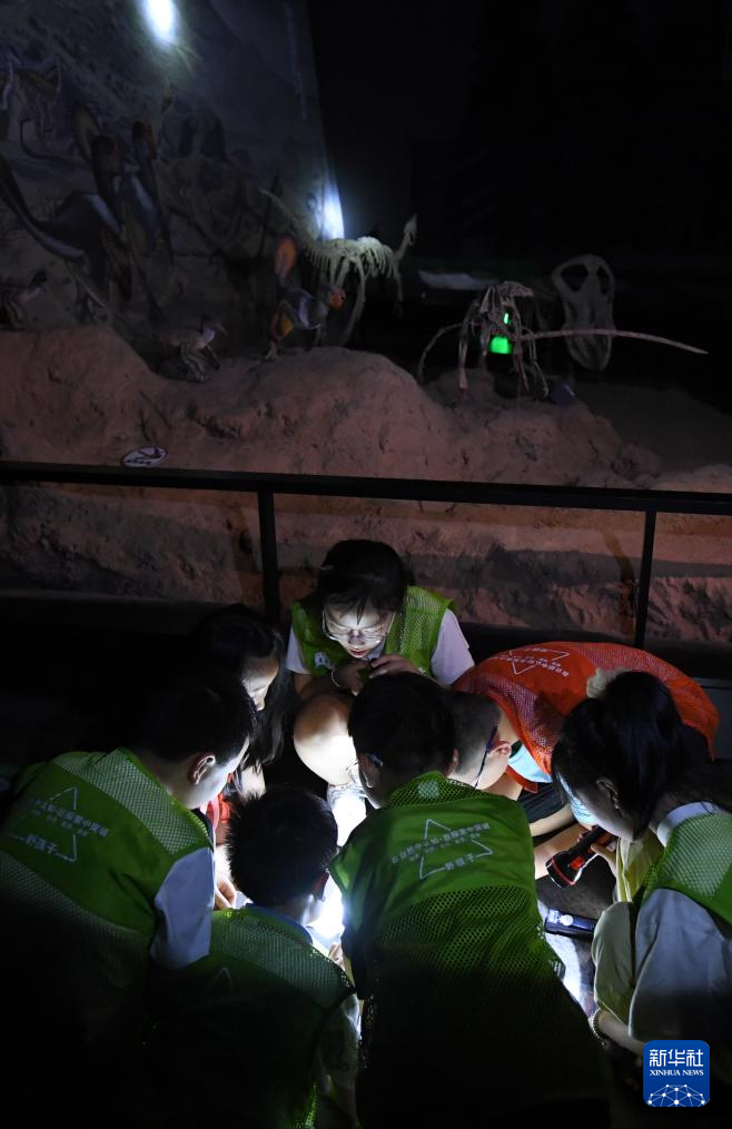 7月26日,参加夜游的孩子们在博物馆内了解恐龙。