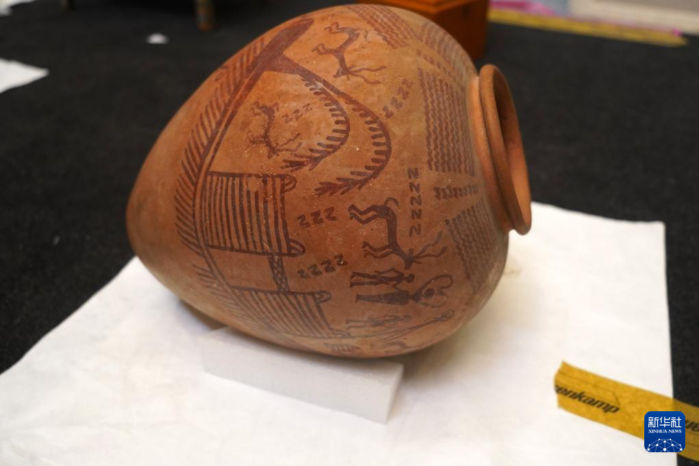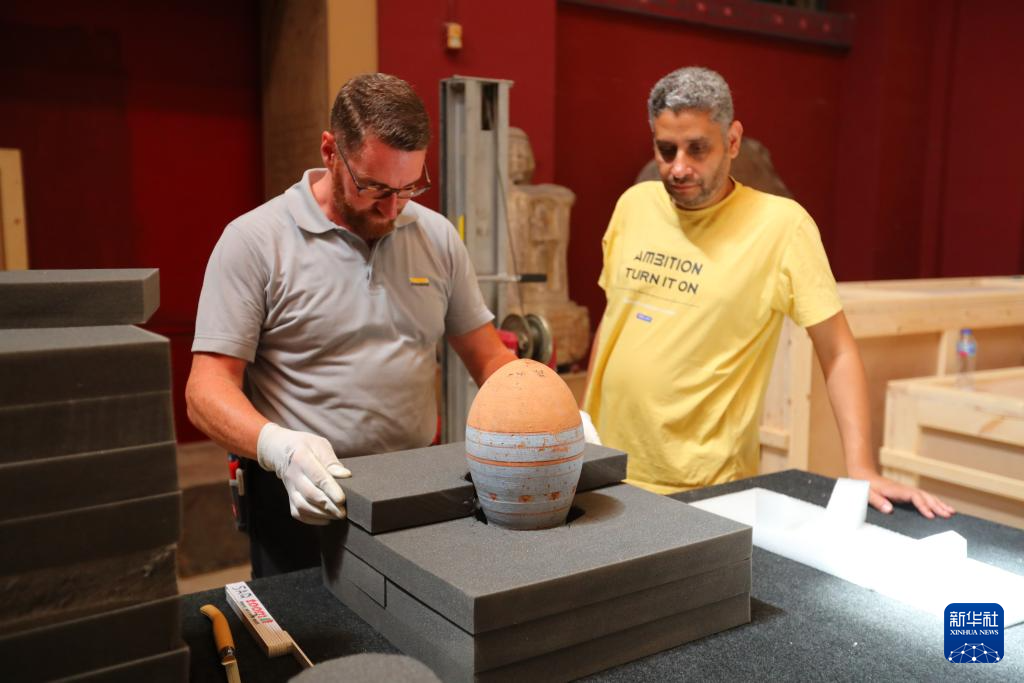 5月27日,在位于埃及首都开罗的埃及国家博物馆,工作人员对一件彩陶罐进行打包。