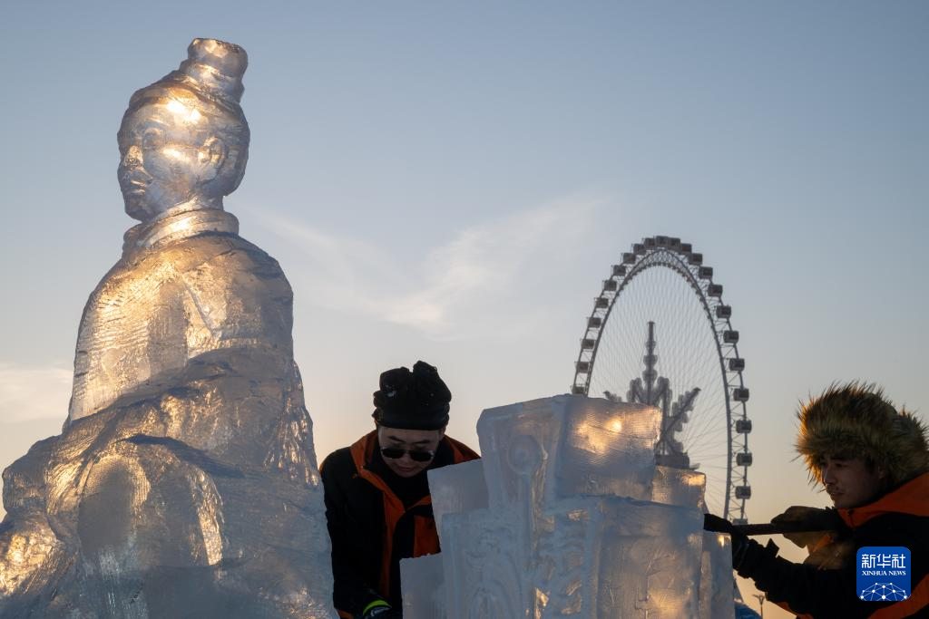 1月4日,在哈尔滨冰雪大世界园区,大庆师范学院美术与设计学院冰雕团队的成员在雕刻“冰马俑”。