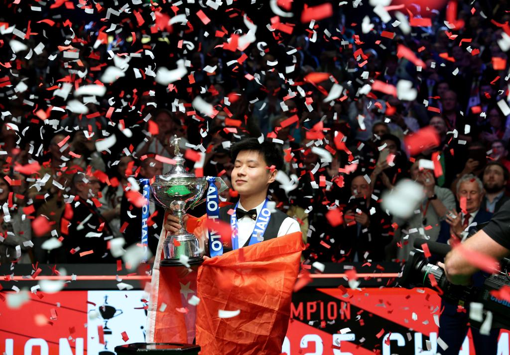 5月5日,赵心童在英国谢菲尔德举行的2025年斯诺克世锦赛颁奖仪式上。新华社发(翟政摄)