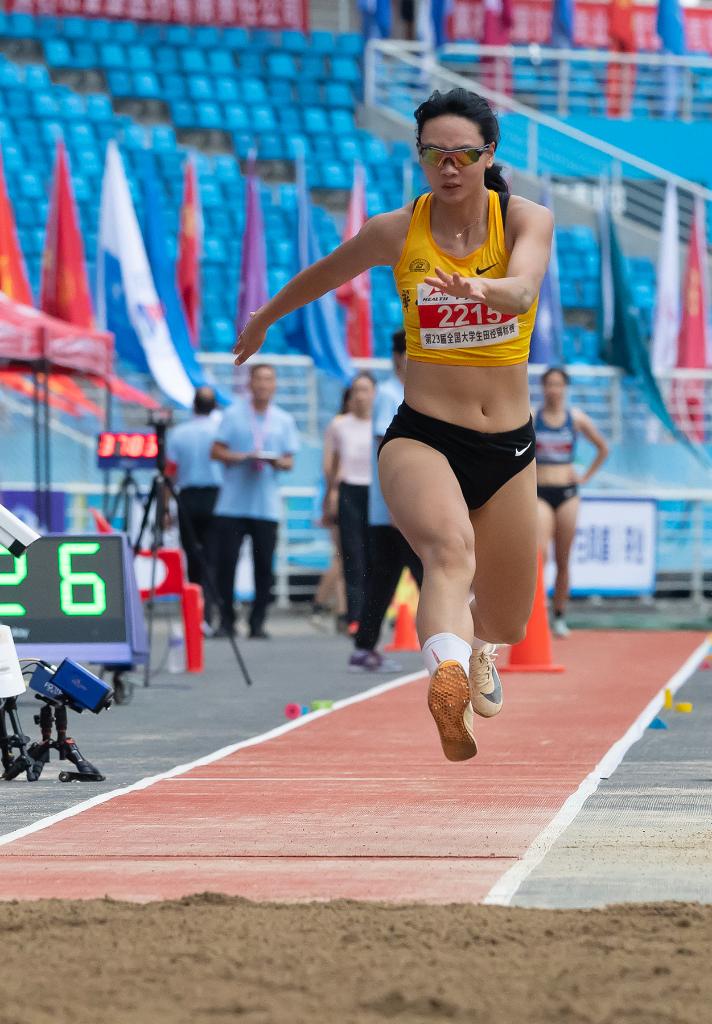 来自黄石的24岁跳远选手杨扬在本届全国大学生田径锦标赛上参加女子三级跳远比赛。陈子才 摄