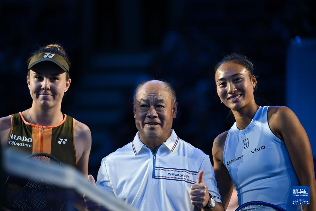 9月29日,郑钦文(右)、诺斯科娃(左)和挑边嘉宾李宁在比赛前合影。