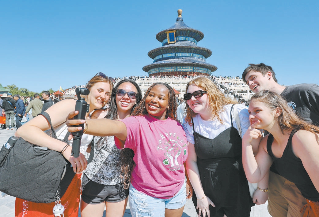 “五一”假期,入境游持续升温,大批外国游客在天坛公园游览。 王新摄