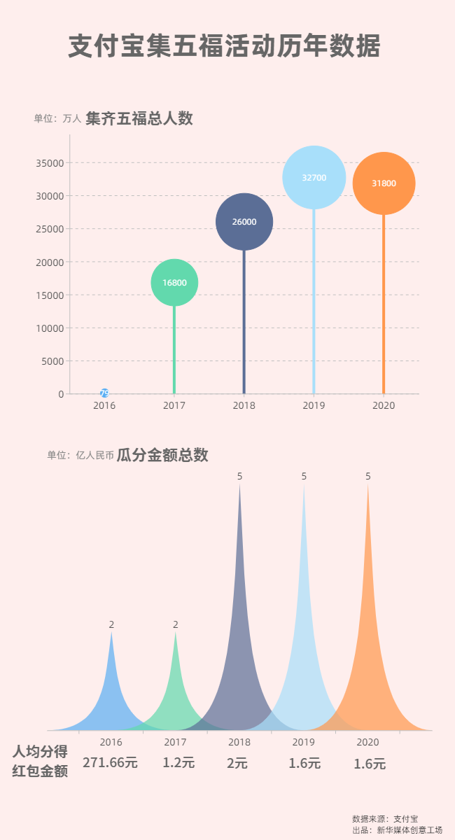 自2016年支付寶推出“集五福”的活動至今已有五個年頭。從最開始只有幾十萬用戶參與,到如今幾億人共同狂歡。支付寶數(shù)據(jù)顯示,截至2月11日零點(diǎn),支付寶集五?;顒庸矊懴陆?.7億個福字,共2.6億網(wǎng)友在線上手寫了福字,送給親朋好友,其中還有350萬福字通過支付寶打印、寄送回家。今年參與紅包拜年的用戶上漲了近270%,“紅包”相關(guān)搜索量也隨之大漲538%。