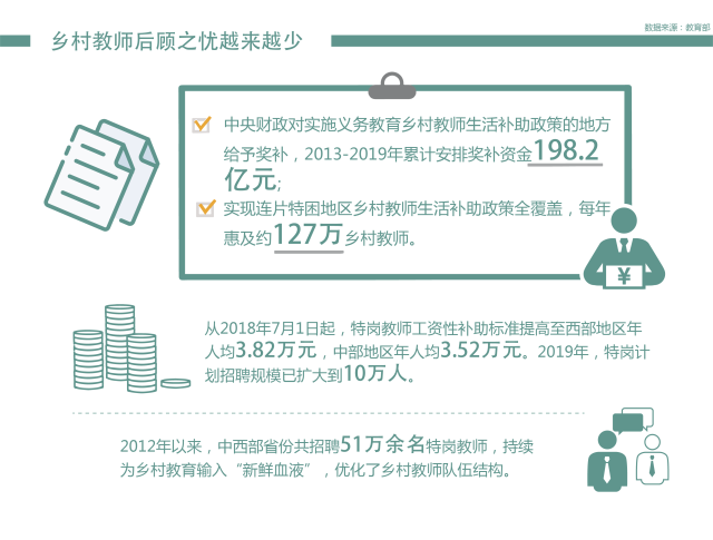 ????? 根據(jù)教育部公布的數(shù)據(jù),截至2018年底,全國(guó)共有鄉(xiāng)村教師290多萬人,其中中小學(xué)近250萬人,幼兒園42萬多人,40歲以下的青年教師占58.3%。2013年以來,中央財(cái)政在支持鄉(xiāng)村教師的生活補(bǔ)助方面已經(jīng)撥付資金157億元,其中2018年45億元,政策惠及中西部8萬多所鄉(xiāng)村學(xué)校中的127萬名教師,補(bǔ)助最高的每月達(dá)到2000元。