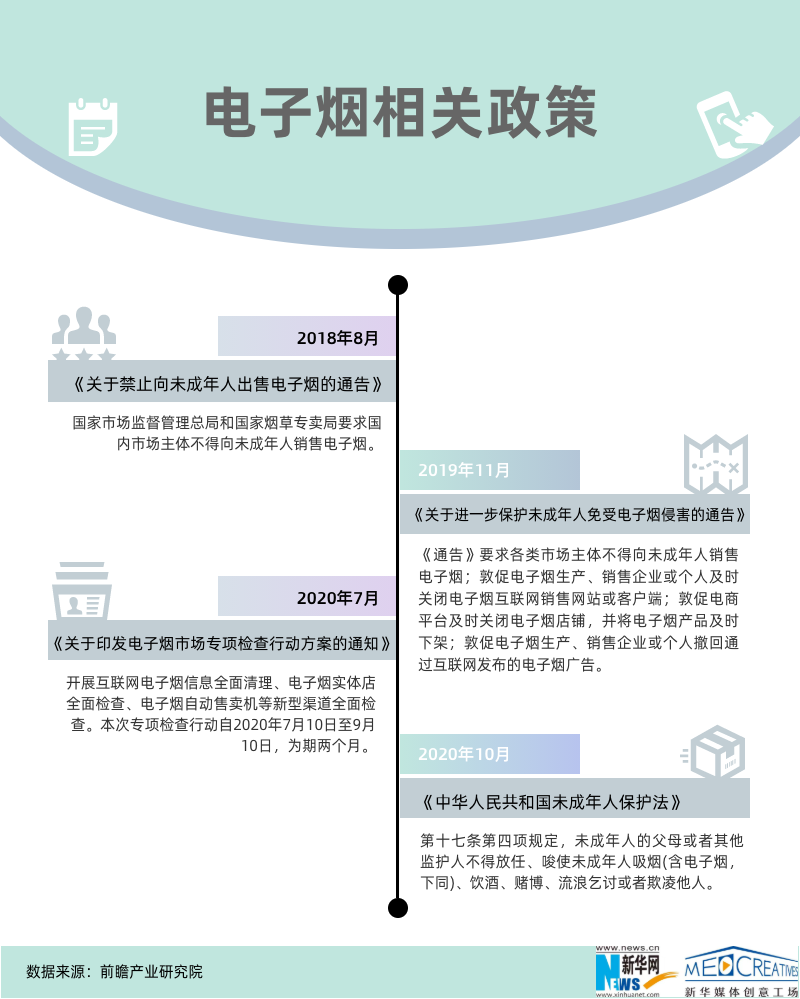 ????? 此前,我國關(guān)于電子煙的政策監(jiān)管問題一直是懸在電子煙行業(yè)之上的“達摩克利斯之劍”。2018-2020年,我國針對電子煙逐步出臺了相關(guān)政策,尤其是對容易落入誘惑陷阱的未成年增強了保護,并開始禁止網(wǎng)上銷售,電子煙的監(jiān)管措施正在逐步加強。