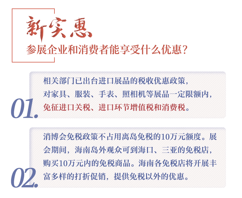 ??? 除了空前的展覽規(guī)模,本屆消博會還為參展企業(yè)和消費(fèi)者提供稅收優(yōu)惠政策:家具、服裝、手表、照相機(jī)等展品一定限額內(nèi),免征進(jìn)口關(guān)稅、進(jìn)口環(huán)節(jié)增值稅和消費(fèi)稅,并且消博會提供的免稅政策不占用離島免稅的10萬元額度。