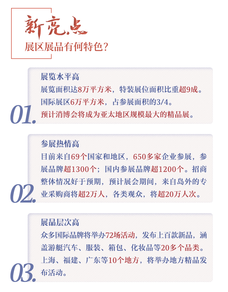 ??? 本屆中國國際消費(fèi)品博覽會規(guī)模盛大,立志于打造亞太地區(qū)規(guī)模最大的精品展。空前的規(guī)模吸引了來自69個國家和地區(qū)的650多家企業(yè)參展,參展品牌超1300個,其中國內(nèi)參展品牌超1200個。從服飾箱包到美妝精品,從珠寶鉆石到游艇汽車,將有上百款消費(fèi)精品首發(fā)首秀。