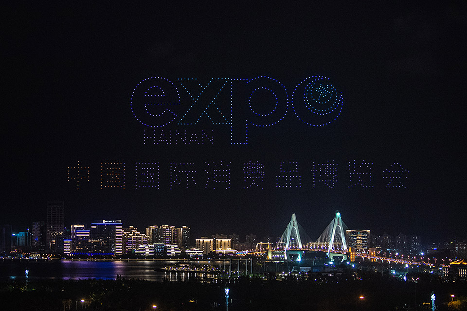 ??? 首屆中國國際消費(fèi)品博覽會于5月7日至10日在位于??诘暮D蠂H會展中心舉辦。5月6日晚,海口市上演無人機(jī)表演秀,迎接首屆消博會的舉辦。新華社記者 蒲曉旭 攝