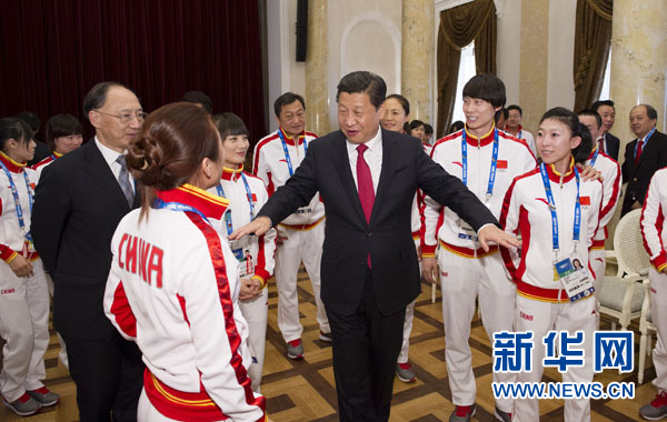 ??? 2月7日,中共中央總書記、國家主席、中央軍委主席習近平在俄羅斯索契親切看望參加第二十二屆冬季奧林匹克運動會的中國體育代表團。這是習近平同運動員親切交流。新華社記者 黃敬文 攝