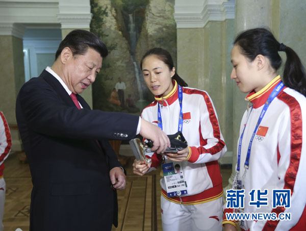 ??? 2月7日,中共中央總書記、國家主席、中央軍委主席習近平在俄羅斯索契親切看望參加第二十二屆冬季奧林匹克運動會的中國體育代表團。這是運動員向習近平介紹冰雪運動器材。新華社記者 蘭紅光 攝