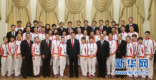 ??? 2月7日,中共中央總書記、國家主席、中央軍委主席習近平在俄羅斯索契親切看望參加第二十二屆冬季奧林匹克運動會的中國體育代表團。這是習近平同代表團成員集體合影。新華社記者 蘭紅光 攝