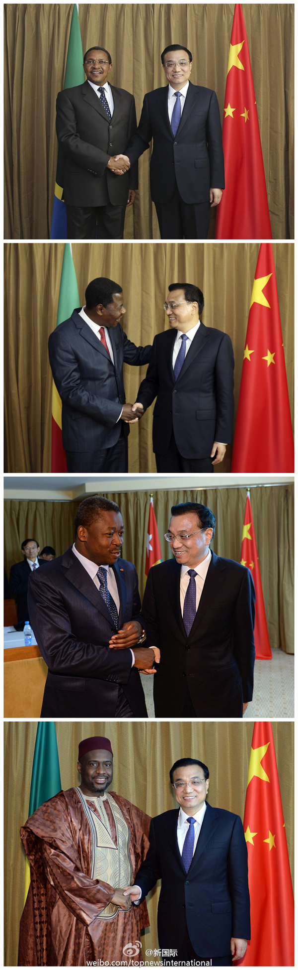 ????新華網(wǎng)北京5月8日電 據(jù)新華社“新國際”微博報道,李克強7日分別會見了出席第24屆世界經(jīng)濟論壇非洲峰會的坦桑尼亞、貝寧、多哥三國總統(tǒng)和馬里總理。會見中,四國領導人對李克強在非盟演講中提出的中非“461”合作框架表示高度贊同,稱其符合非洲人民的心愿,愿努力將其轉化為實實在在的成果。