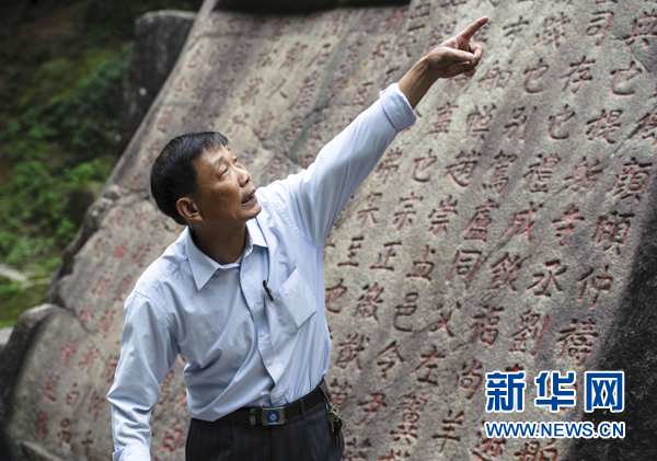 ??? 5月8日,在福建省泉州市豐州鎮(zhèn)九日山,胡家其老人在介紹紀(jì)錄祈求海神保佑船只順風(fēng)的祈風(fēng)石刻。 新華社記者 姜克紅 攝