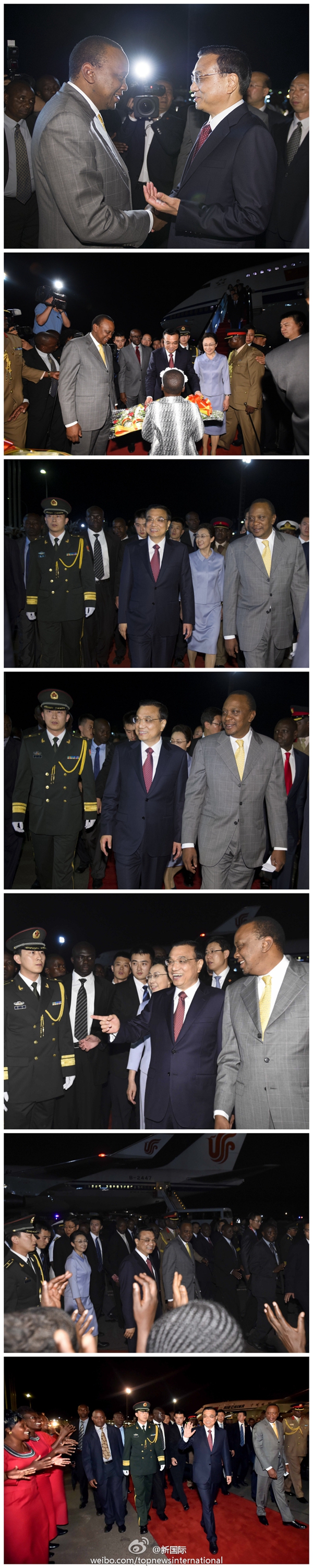 ????新華網(wǎng)北京5月10日電? 據(jù)新華社“新國際”微博報道,李克強(qiáng)總理9日晚乘專機(jī)抵達(dá)內(nèi)羅畢,肯尼亞總統(tǒng)肯雅塔和副總統(tǒng)魯托率肯政府高級官員到機(jī)場迎接,當(dāng)?shù)孛癖娨允⒋蟮奶厣褡甯栉?,歡迎中國貴賓到來。