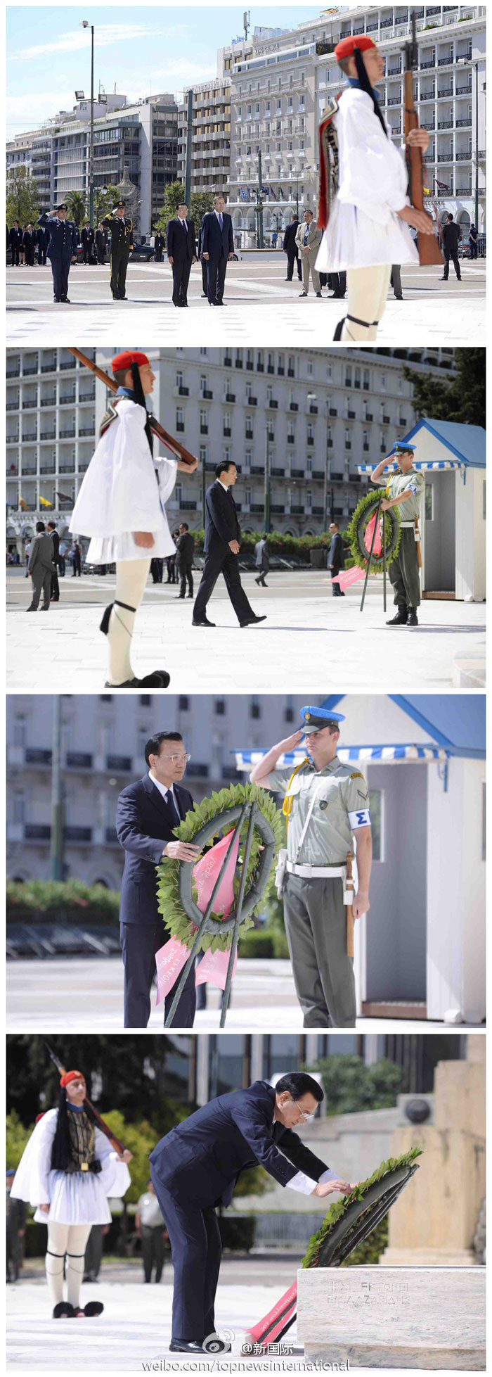 ??? 新華網(wǎng)北京6月20日電 據(jù)新華社“新國際”微博報道,正在希臘訪問的李克強總理19日向希臘無名戰(zhàn)士紀(jì)念碑獻(xiàn)花圈。該紀(jì)念碑1932年建成,碑上鐫刻公元前5世紀(jì)希臘政治家伯里克利斯一篇悼詞中的兩句名言:“全世界杰出戰(zhàn)士之墓”、“安放無名氏的床第”,及希臘從上世紀(jì)初到五十年代與外國交戰(zhàn)的戰(zhàn)役名稱和地名。