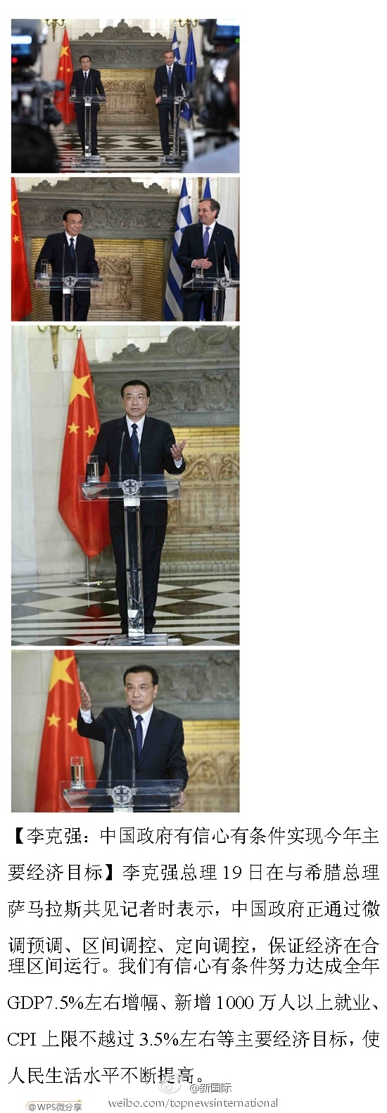 ??? 新華網(wǎng)北京6月20日電 據(jù)新華社“新國際”微博報(bào)道,李克強(qiáng)總理19日在與希臘總理薩馬拉斯共見記者時表示,中國政府正通過微調(diào)預(yù)調(diào)、區(qū)間調(diào)控、定向調(diào)控,保證經(jīng)濟(jì)在合理區(qū)間運(yùn)行。