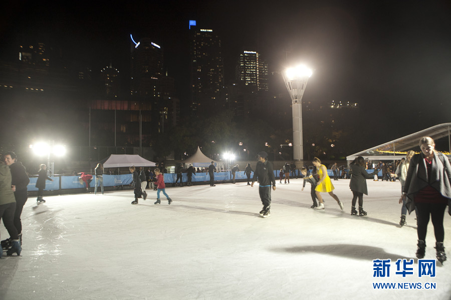 ????6月13日起,為期1個(gè)月的大型冬季冰雪活動在悉尼市中心的情人港(Darling Harbour)為悉尼市民冬季的生活增添了些許名副其實(shí)的冬季氣氛。圖為悉尼情人港塔巴隆公園(Tunmbalong Park)上,巨大的戶外滑冰場吸引了成千上萬名市民前來體驗(yàn)。新華社記者 李冰 攝