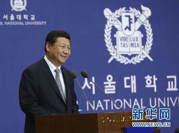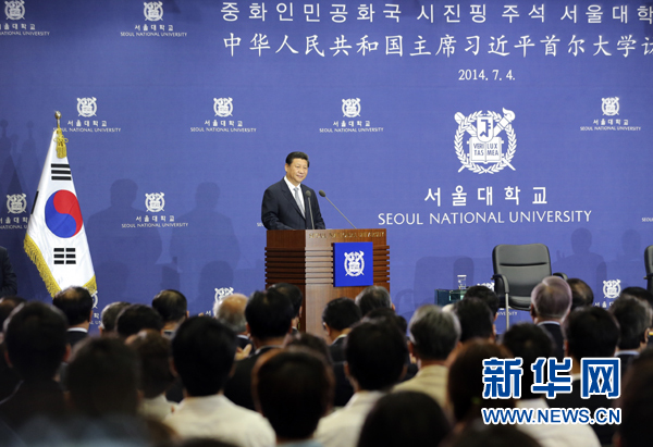 ???? 7月4日,國家主席習(xí)近平在韓國國立首爾大學(xué)發(fā)表題為《共創(chuàng)中韓合作未來 同襄亞洲振興繁榮》的重要演講。 新華社記者 蘭紅光 攝