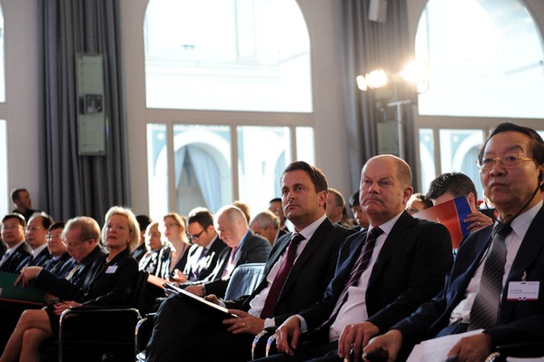 ????盧森堡首相貝特爾(右三)、漢堡市市長舍爾茨(右二)、中國工業(yè)經(jīng)濟(jì)聯(lián)合會會長李毅中(右一)出席第六屆漢堡峰會開幕式。新華社記者商婧攝