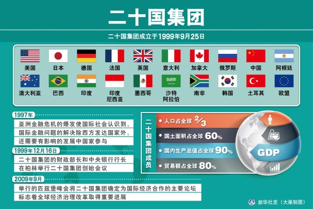 可以說,中國成功地引領了亞太區(qū)域合作方向與政策制定,極大地增強了中國在亞太治理中的發(fā)言權。如果說,APEC是一個成員限于亞太地區(qū)的區(qū)域性治理平臺,那二十國集團(G20)就是一個覆蓋面更廣的、全球性的治理平臺。G20由西方七國集團、俄羅斯和中國等主要新興經濟體組成,經濟規(guī)模約占全球90%,貿易總額占全球總量的80%。
