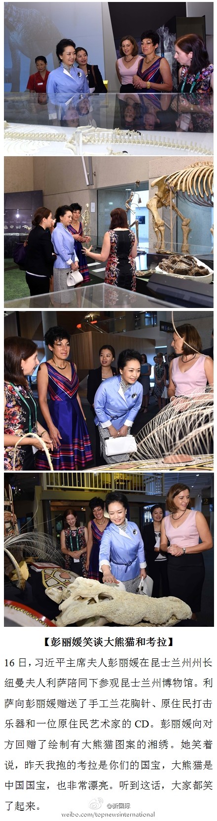 ????新華網(wǎng)北京11月16日電 據(jù)新華社“新國際”微博報(bào)道,16日,習(xí)近平主席夫人彭麗媛在澳大利亞昆士蘭州州長(zhǎng)紐曼夫人利薩陪同下參觀昆士蘭州博物館。