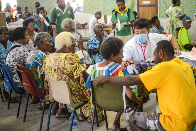????(圖為2014年9月5日,中國(guó)海軍和平方舟醫(yī)院船的前出醫(yī)療分隊(duì)前往位于瓦努阿圖首都維拉港郊區(qū)的美麗村,為因路途較遠(yuǎn)而不方便前往和平方舟醫(yī)院船就診的當(dāng)?shù)鼐用襁M(jìn)行醫(yī)療服務(wù)。新華社記者覃海石攝)