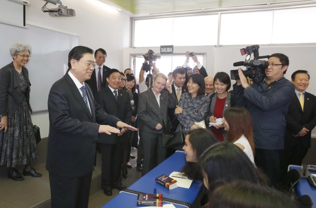??? 校長羅德里格斯向張德江介紹了這所孔子學院成立4年多來的發(fā)展情況,并向張德江贈書。