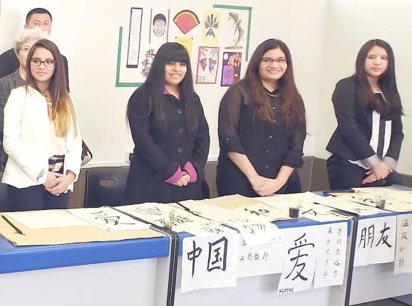 ??? 隨后,張德江走進一間教室,這里掛著紅紅的“中國結(jié)”、燈籠,墻上貼著一幅對聯(lián)“根深則葉茂,源遠而流長”。學生們有的在看中文書、有的在剪紙、還有的在練書法。